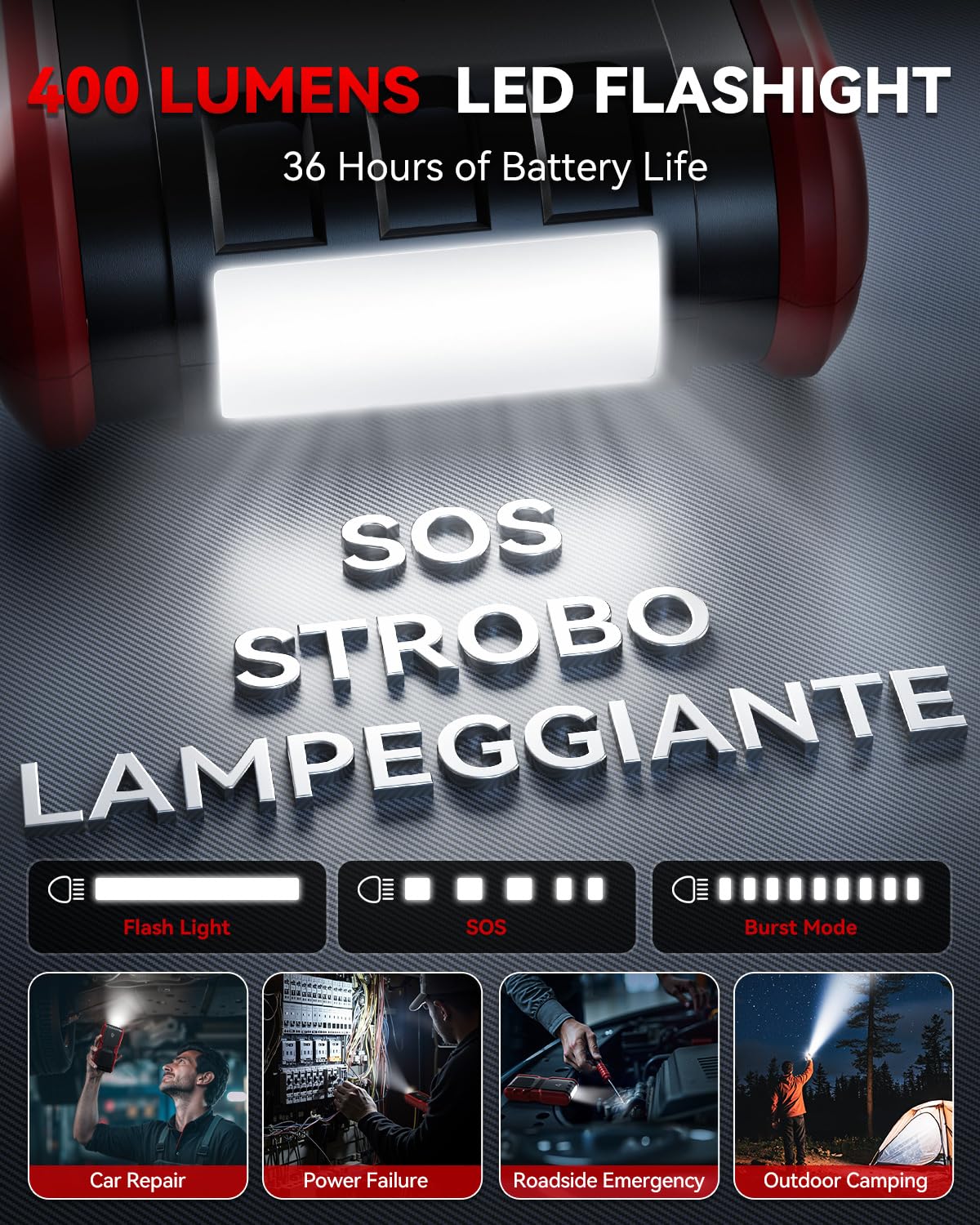 - 【3 HIGH LINGTHING MODES】Car battery charger jump starter with 3 lighting modes which represent flashlight, SOS, strobe, it can be used as a torch, life-saving signal light, and traffic warning light. Whether you need light to change a tire, inspect an engine, or need to warn oncoming traffic that you are broken down on the side of the road, the ultra-bright LED flashlight will have you covered
